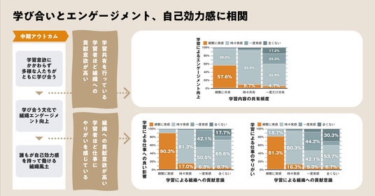 アウトカムの進捗を調査するために、Schoo for Businessの学習者1,781名を対象にロジックモデルKPIに基づくアンケート調査を実施した結果、「学び合い」の行動が組織エンゲージメントや自己効力感の向上、やりがいと強く相関していることが明らかになりました。