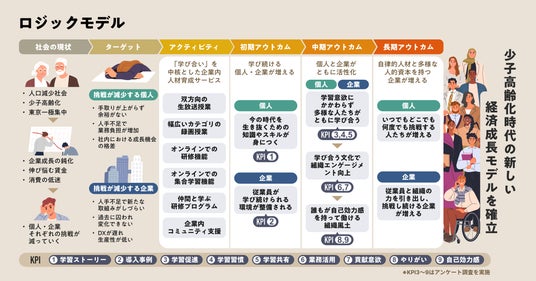 Schoo for Businessは、「学び合い」を通じて、個人と企業の挑戦力を取り戻すことを目指しています。ロジックモデルでは、人口減少や意欲の低下という課題に対し、学びがどのように変化を生むかを体系的に示しています。中期的には、学び合う文化が根づき、エンゲージメントや自己効力感が高まることで、組織と個人がともに活性化すること。長期的には、いつでも挑戦できる人材と、挑戦を支える企業が増加することが、社会的インパクトへとつながります。
