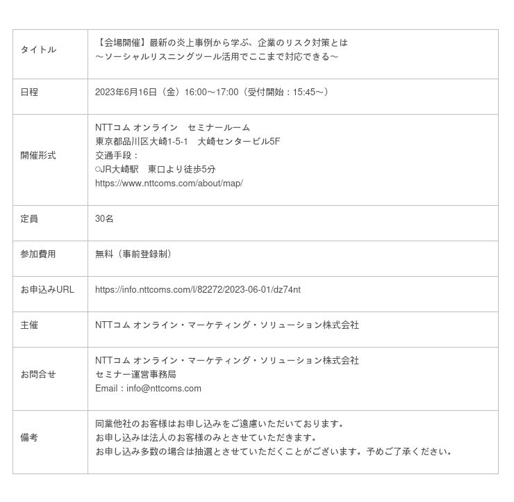 NTTコム オンライン・マーケティング・ソリューション株式会社(本社:東京都品川区、代表取締役社長:塚本 良江、以下NTTコム オンライン)は、2023年6月16日(金)にソーシャルリスニングツール活用による企業のリスク対策セミナーを開催いたします。