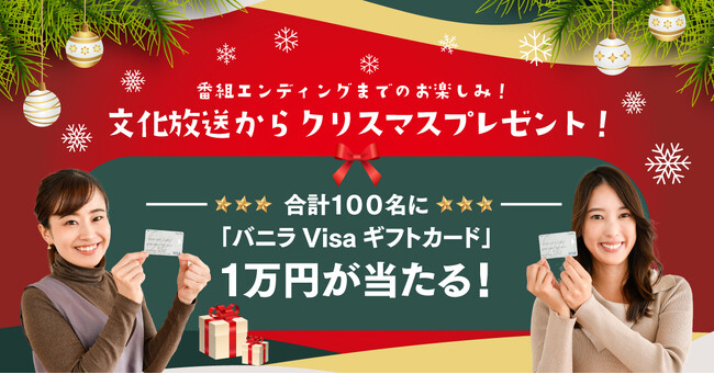 今回のスペシャルウィークでは、特別企画「番組エンディングまでのお楽しみ!文化放送からクリスマスプレゼント!」を実施。期間中、平日ワイド5番組のエンディング後にキーワードを発表し、キーワードを応募フォームから送って頂いた方の中から抽選で100名様に、Visa加盟店で使えるギフトカード「バニラVisaギフトカード」1万円分をプレゼント。なお、キーワードは日替わりで、毎日応募のチャンスがあります。