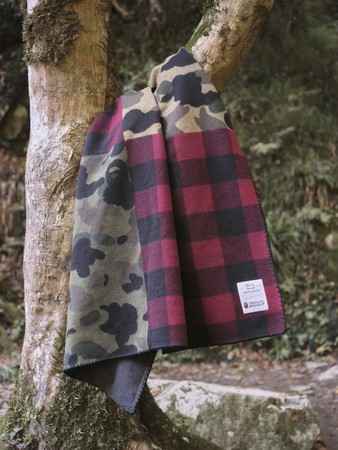 「ブランケット」はBAPE(R)️ CAMOとバッファローチェック柄をミックスしたマルチアートワークデザイン。裏面はウールの無地とマキシのコラボロゴをジャカードで表現、ブランケットの枠を囲むようにブラックのクロッチステッチ、フロントにはコラボラベルのエンブロイダリーが施されています。