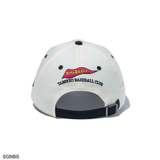 と「とらさん」の顔を、右サイドには株式会社ギンビスのロゴ、リアには架空の野球クラブ「TABEKKO BASEBALL CLUB」のアーチロゴとフラッグデザインを刺繍しました。