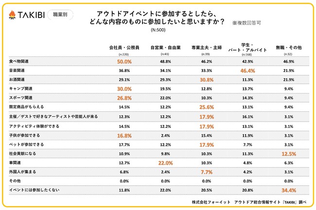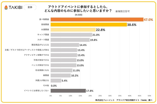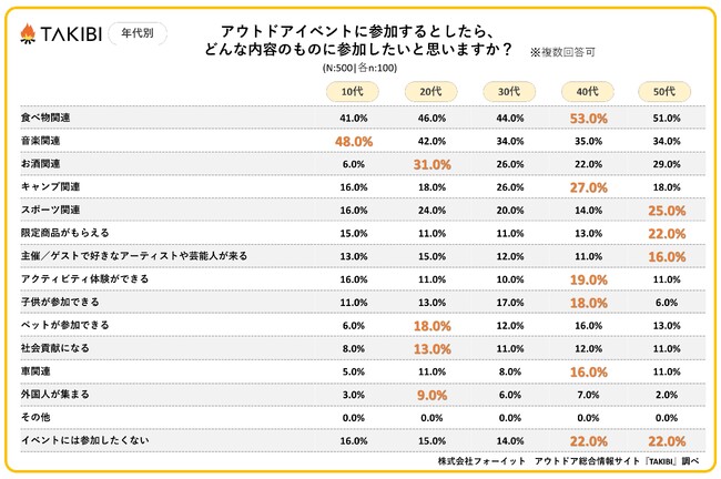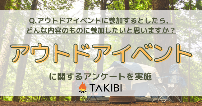 キャンプやグランピングを中心としたアウトドア総合情報サイト「TAKIBI」の運営をおこなう株式会社フォーイットは、全国の10代~50代までの男女500人を対象にアウトドアイベントに関するアンケートを実施し、男女別・年代別等の特徴についてまとめました。