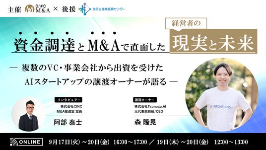 株式会社CINC(本社:東京都港区、代表取締役社長:石松友典、以下CINC)は、ベンチャー・スタートアップ企業経営者向けセミナー『港区立産業振興センター後援|【M&A体験談】資金調達とM&Aで直面した「経営者の現実と未来」~複数のVC・事業会社から出資を受けた "AIスタートアップ" の譲渡オーナーが語る~』を開催いたします。
