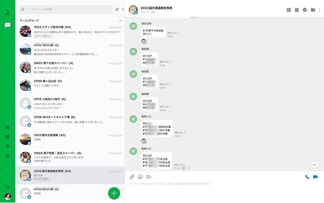 画像上:チェックポイントにいるスタッフからの通過速報もトークで実施。あえてテキストのみの共有とすることで、通過情報を即座に追えるようにしています。