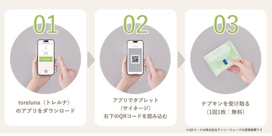 トレルナは、トイレの個室で生理用ナプキンを無料で受け取ることができるサービスです。個室内のデジタルサイネージに表示されるQRコードをスマートフォンアプリで読み取ることで、ナプキンを受け取ることができます。デジタルサイネージで放映される広告収益によりナプキン代を賄う仕組みにより、利用者の費用負担なく継続的なサービス提供を実現しています。