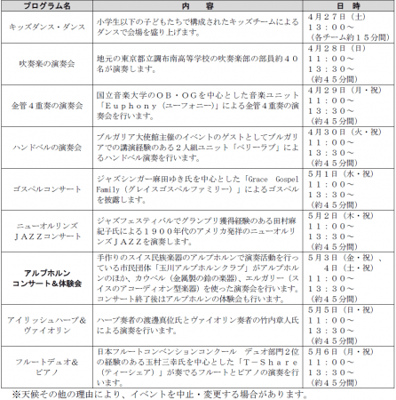 「ゴールデンウィーク音楽フェア」は、スイスの民族楽器である「アルプホルンのコンサート」や実際にアルプホルンを吹くことができる「アルプホルン体験会」のほか、小学生以下の子どもたちで構成されたダンスチームによる「キッズダンス・ダンス」や「ゴスペルコンサート」など、日替わりで音楽イベントを開催します。