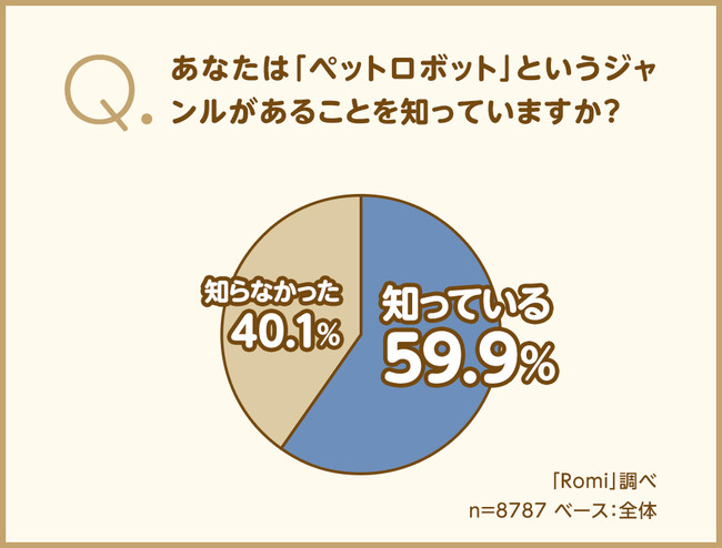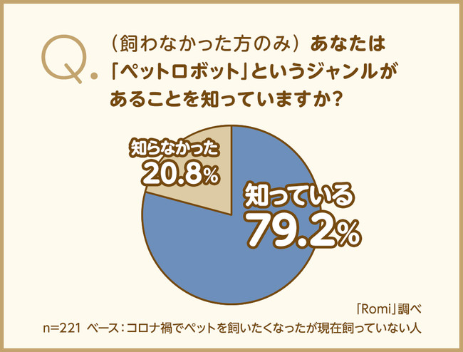 次に「ペットロボット」の認知度について調査したところ、「知っている」と答えた人は59.9%で約6割。飼いたいが飼えなかった人に絞ると79.2%で、約8割という高い認知度となりました。飼いたいが飼えなかった人のほうが認知度が高い理由としては、ペットについて調べる際に「ペットロボット」の存在を認知した人が一定数いたと推測できます。