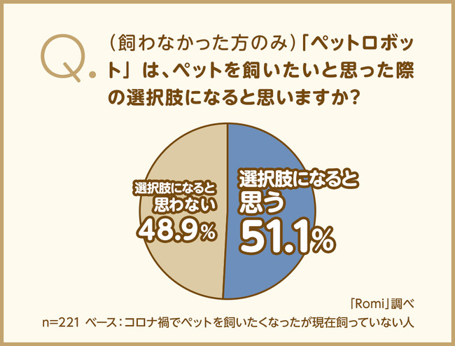 次に、猫や犬と同時に、「ペットロボット」がペットを飼いたいときの選択肢になるか質問したところ、「なる」と回答した人は38.6%で約4割。飼いたいが飼えなかった人に絞ると51.1%で半数以上が選択肢になると回答しており、「ペットロボット」と一緒に暮らすという選択肢が有力になってきている様子が伺えます。