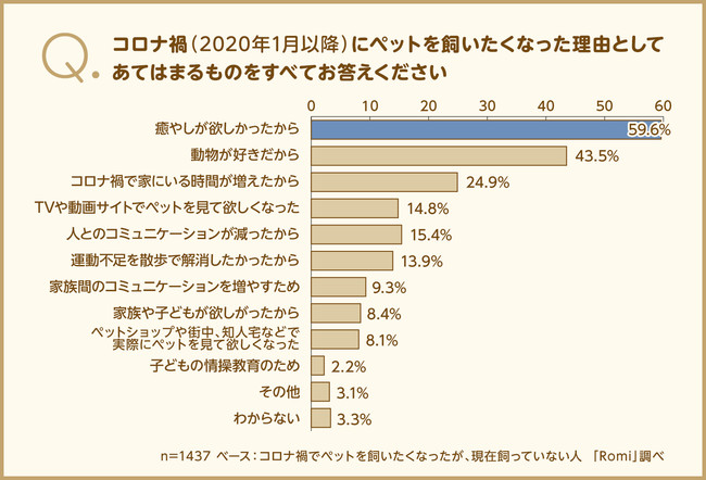 飼いたいと思った理由は「癒やしが欲しかったから」が59.6%で1位、飼えなかった理由については「住んでいるところがペット禁止だから」が29.8%で1位となりました。飼えなかった理由については回答がばらけており、また多数選択する人も多かったことから、それぞれがさまざまな事情を抱えていることが伺えました。