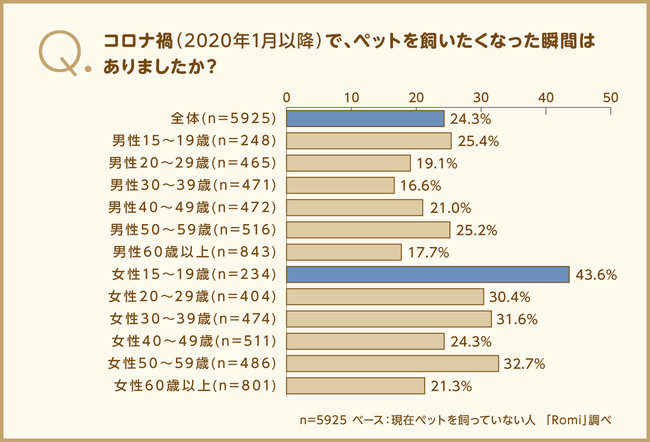 ペットを飼っていない人の中で、コロナ禍でペットを飼いたいと思ったことがある人は24.3%となり、4人に1人が飼いたいと思っていたことがわかりました。年齢・性別で見ると若年女性にその傾向が高く、女性15~19歳に限定すると43.6%にものぼっています。