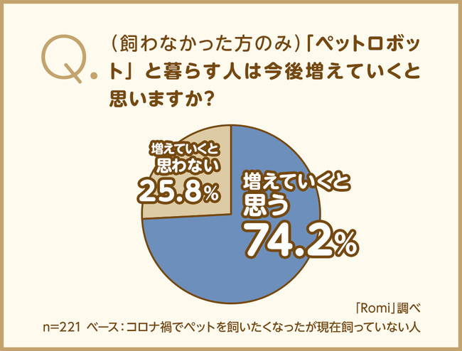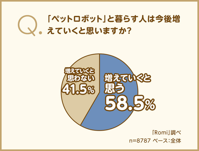 最後に、「ペットロボットと暮らす人が今後増えていくと思いますか?」という質問に対して、「思う」と回答した人は58.5%。飼いたいが飼えなかった人に絞ると74.2%と、4人に3人が「思う」と回答しており、ペットを飼いたいと思う・思わない問わず、「ペットロボット」という存在が未来のパートナーになりうると予測している人が過半数以上いるという結果になりました。