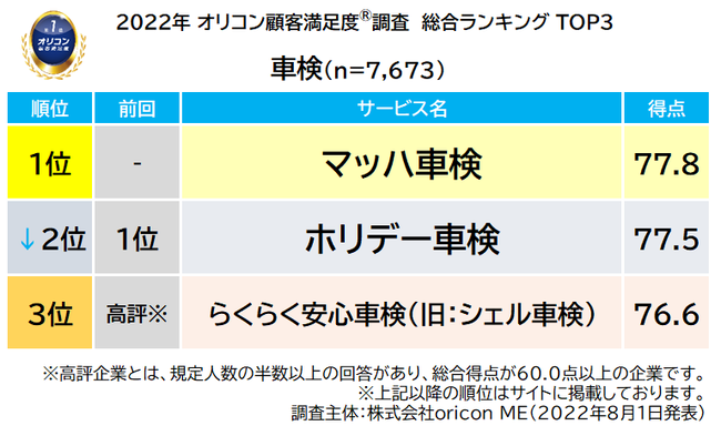 《調査概要》 2022年 オリコン顧客満足度(R)調査 車検 (2022年8月1日発表)
