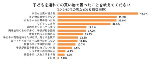 次いで、「買い物に集中できない」「子どもがぐずってしまう」といった悩みが多い結果となった。