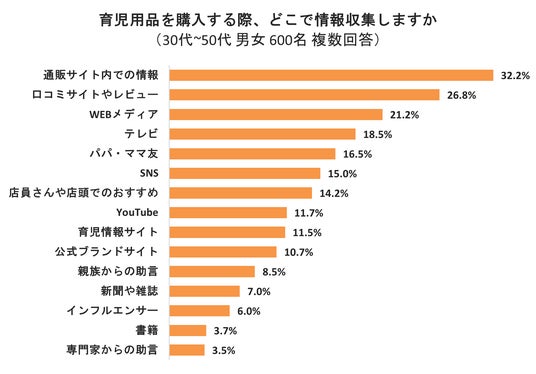 育児関連商品の情報収集元TOP3は「通販サイト内での情報」「口コミやレビュー」「WEBメディア」