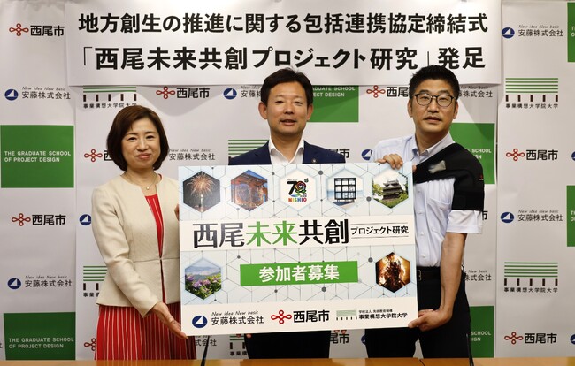 愛知県西尾市(市長:中村健)、安藤株式会社(本社:愛知県名古屋市 社長:安藤仁志)、学校法人先端教育機構 事業構想大学院大学(本部:東京都港区 学長:田中里沙)の三者は、西尾市域の発展に寄与する「地方創生の推進に関する包括連携協定」を2023年7月31日付で締結し、「西尾未来共創プロジェクト研究」の発足を発表しました。