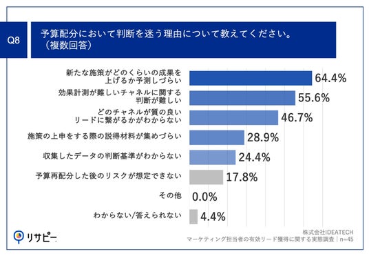 Q7で「非常にそう思う」「ややそう思う」と回答した方に、「Q8.予算配分において判断を迷う理由について教えてください。(複数回答)」(n=45)と質問したところ、「新たな施策がどのくらいの成果を上げるか予測しづらい」が64.4%、「効果計測が難しいチャネルに関する判断が難しい」が