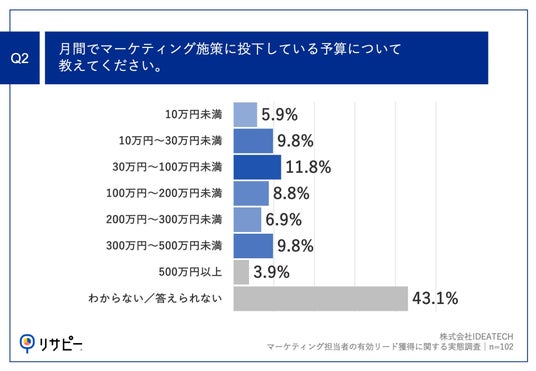 「Q2.月間でマーケティング施策に投下している予算について教えてください。」(n=102)と質問したところ、「30万円~100万円未満」が11.8%、「10万円~30万円未満」が9.8%、「300万円~500万円未満」が9.8%という回答となりました。