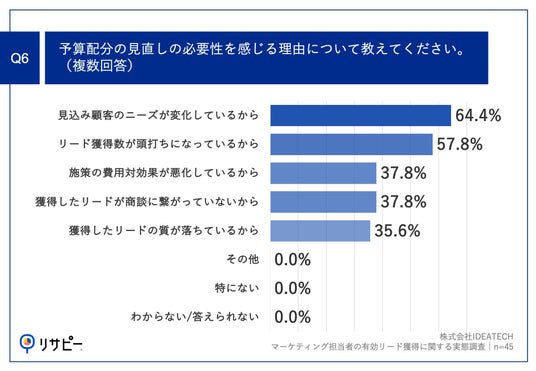 Q5で「非常に感じる」「やや感じる」と回答した方に、「Q6.予算配分の見直しの必要性を感じる理由について教えてください。(複数回答)」(n=45)と質問したところ、、「見込み顧客のニーズが変化しているから」が64.4%、「リード獲得数が頭打ちになっているから」が57.8%、「施策の費用対効果が悪化しているから」が37.8%という回答となりました。