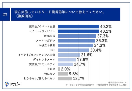 「Q3.現在実施しているリード獲得施策について教えてください。(複数回答)」(n=102)と質問したところ、「展示会/イベント出展」が40.2%、「セミナー/ウェビナー」が40.2%、「Web広告」が37.3%という回答となりました。