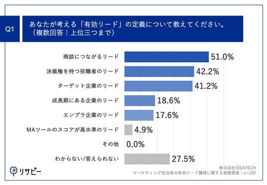「Q1.あなたが考える「有効リード」の定義について教えてください。(複数回答|上位三つまで)」(n=102)と質問したところ、「商談につながるリード」が51.0%、「決裁権を持つ役職者のリード」が42.2%、「ターゲット企業のリード」が41.2%という回答となりました。