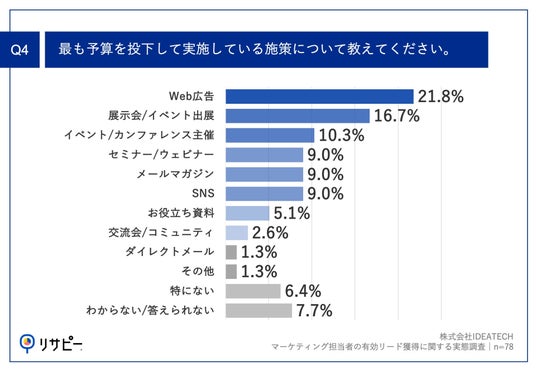 Q3で「特にない」「わからない/答えられない」以外を回答した方に、「Q4.最も予算を投下して実施している施策について教えてください。」(n=78)と質問したところ、「Web広告」が21.8%、「展示会/イベント出展」が16.7%、「イベント/カンファレンス主催」が10.3%という回答となりました。