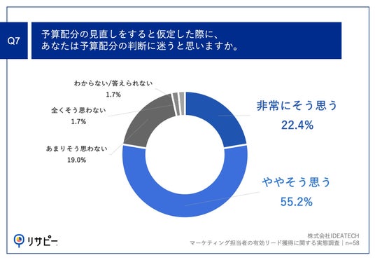 Q2で「わからない/答えられない」以外を回答した方に、「Q7.予算配分の見直しをすると仮定した際に、あなたは予算配分の判断に迷うと思いますか。」(n=58)と質問したところ、「非常にそう思う」が22.4%、「ややそう思う」が55.2%という回答となりました。
