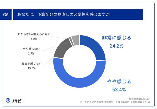 Q2で「わからない/答えられない」以外を回答した方に、「Q5.あなたは、予算配分の見直しの必要性を感じますか。」(n=58)と質問したところ、「非常に感じる」が24.2%、「やや感じる」が53.4%という回答となりました。