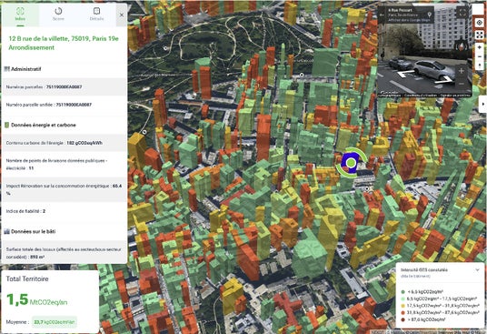 Nexqtの分析画面イメージ(パリ):建物ごとのエネルギー消費やCO2排出量を3Dマップ上で可視化