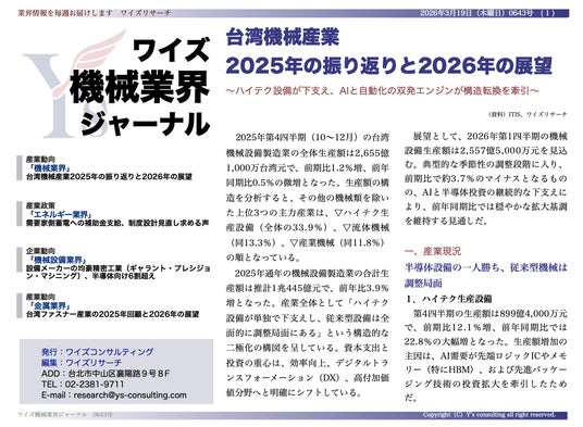 ワイズコンサルティング グループ(本社:中華民国台北市、代表取締役:吉本康志)は台湾機械業界専門誌「ワイズ機械業界ジャーナル」の2026年3月第3週号を発行しました。
