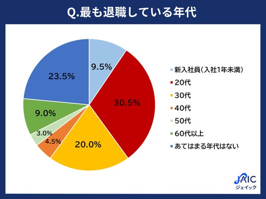 「最も退職している年代をひとつ選択してください」と質問したところ、「20代」が30.5%、「あてはまる年代はない」が23.5%、「30代」が20.0%、「新入社員(入社1年未満)」が9.5%、「60代以上」が9.0%、「40代」が4.5%、「50代」が3.0%となり、20代という回答が最も多い結果となりました。