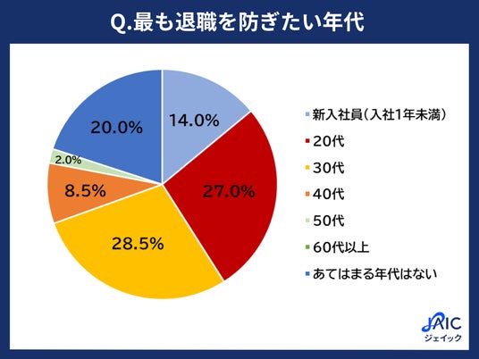 ■最も退職を防ぎたい年代:1位「30代」(28.5%)、2位「20代」(27.0%)