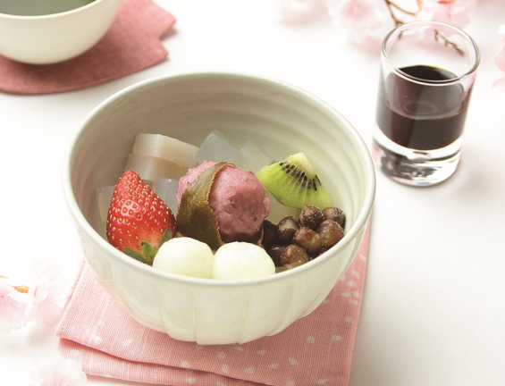 桜の葉で巻いた香り高い桜あんに、いちご、キウイ、白玉を添えた春の彩りいっぱいのあんみつです。