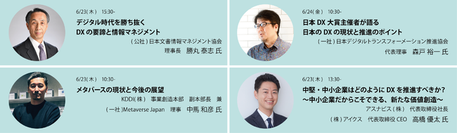展示会場内にて、地方自治体によるDX推進の先進事例を紹介する「自治体特別講演」と、業界を牽引する識者が連日登壇する「特別講演」を実施します。自治体特別講演、特別講演の聴講は事前のお申込が必要です。公式ホームページの「講演聴講申込フォーム」よりお申込みください。