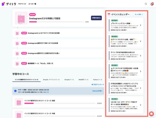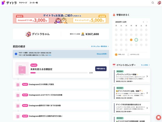 株式会社エフ・コード(本社:東京都新宿区、代表取締役社長:工藤 勉、証券コード:9211)の連結子会社である株式会社デイトラ(本社:東京都豊島区、代表取締役社長:大滝 昇平、以下「デイトラ」)は、同社が運営するWebスキル特化型オンラインスクールにおいて、受講生向け学習管理システム(LMS)のUI/UXの大規模刷新およびゲーミフィケーション要素を取り入れた新機能の実装を実施いたしましたので、お知らせいたします。