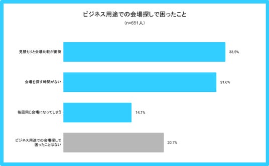 一方で、ビジネスイベントの会場探しは、担当者にとって、目に見えない負担が多いのが実情です。実際にスペースマーケットが実施した調査では、ビジネス利用経験のあるスペースマーケットのゲストの約8割が「ビジネス用途の会場探しで困ったことがある」と回答。理由の上位に「見積もりと会場比較が面倒(33.5%)」「会場を探す時間がない(31.6%)」が占めています。こうした会場探しの負担を軽減し、最適な会場と出会う体験をつくるべく、本サービスを開始しました。
