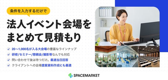 あらゆるスペースを貸し借りできるマーケットプレイス「スペースマーケット」を運営する株式会社スペースマーケット(本社:東京都渋谷区、代表取締役社長:重松大輔、以下、スペースマーケット)は、法人イベントに対応した会場の一括見積もりが簡単にできるサービスを開始いたしました。社内研修や、全社総会、懇親会など、イベント企画を担う人事・総務・広報担当者の「探す・選ぶ・比べる」負担を軽減するため、希望条件を入力するだけで、全国2,600件超の会場から最適な提案が届きます。