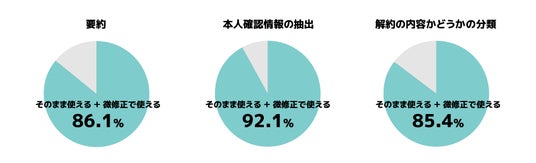 以下は、生成AIにより要約・抽出・分類を行った際の評価結果で、そのまま使える割合が7~8割、微修正で使えるものが8~9割であることを確認しています。