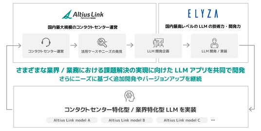 アルティウスリンク株式会社(所在地:東京都新宿区、代表取締役社長:網野 孝、以下 アルティウスリンク)と、大規模言語モデル(LLM)の社会実装を進める株式会社ELYZA(本社: 東京都文京区、代表取締役CEO: 曽根岡 侑也、以下 ELYZA)は、コンタクトセンター事業における生成AI活用において協業を開始します(以下 本協業)。コンタクトセンター特化型のLLMをはじめ、生成AIを活用した新サービスの共同開発を行い、企業のBX(ビジネストランスフォーメーション)を推進するサービスブランド「Altius ONE(R)」※1の機能を拡充、順次提供を開始します。