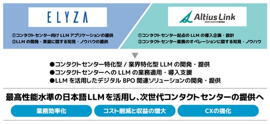 ELYZAの生成AI関連の研究開発力・社会実装力と、アルティウスリンクの国内最大規模のコンタクトセンター運営ノウハウを掛け合わせ、データドリブンな次世代コンタクトセンターサービスの提供を通じた新たな価値創出に向けて本協業にいたりました。