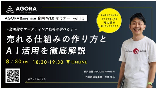 株式会社AGORAでは、2024年8月30日(金)に「売れる仕組みの作り方とA I活用」をテーマにした創業WEBセミナーを開催します。