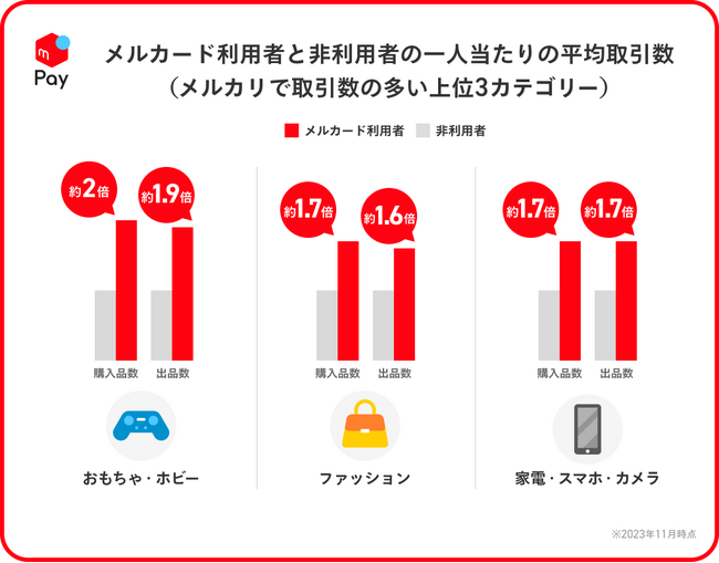 また利用シーンについても調べたところ、「メルカード」の利用者は、非利用者に比べると「メルカリ」における人気カテゴリー上位3つにおいて、出品数・購入数が多い傾向がみられました。非利用者に比べるといずれのカテゴリーでも1.6倍、最も人気な「おもちゃ・ホビー」カテゴリーの購入品数においては2倍となり、人気カテゴリーの取引量に差があることが分かりました。日常的なお買い物だけではなく、趣味等のさまざまな利用シーンにも「メルカード」の利用が広がっています。今回、共通の趣味を持つご家族やご友人等に「メルカード」を勧めるきっかけを提供することで、さらに多くの方に多様なシーンで「メルカード」を活用してお得にお買い物を楽しんでいただきたいと考え、招待した方・された方それぞれにお得なポイントを付与する「メルカード招待キャンペーン」の開催を決定いたしました。