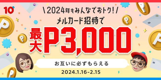 株式会社メルペイ(以下、メルペイ)は、2024年1月16日から2月15日の期間中、招待コードを受け取った方が「メルカード」に入会して利用すると、招待した方・された方それぞれに最大3,000円分のポイントがもらえる「メルカード招待キャンペーン(※1)」を開催いたします。何人でも招待することができ、招待した方がもらえる金額の上限はありません。