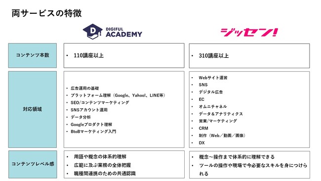 このような課題に対し、アイレップはマーケティング担当者のためのオンライン学習サービス「DIGIFULアカデミー」を、SOTはDX・マーケティング専門eラーニングサービス「ジッセン! オンライン」をそれぞれ提供し、デジタルマーケター育成のためのコンテンツ制作を行ってまいりました。