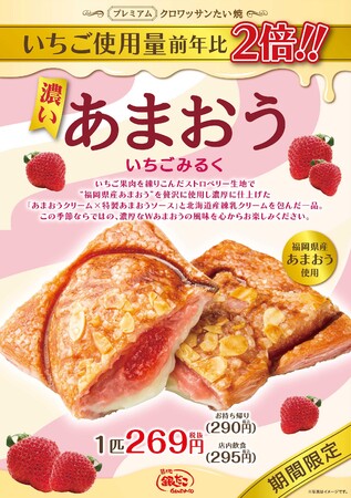 今回の『濃い あまおう いちごみるく』は、従来品からパワーパップをし、いちご使用量が2倍 (当社比) となって、新登場! “福岡県産あまおういちご” を使用した「あまおうクリーム」と「特製あまおうソース」に、“北海道産” の「練乳クリーム」を合わせることで、練乳の濃厚でクリーミーな味わいが、おまおうの魅力でもある “濃い甘み” と “ほのかな酸味” を引き立たせ、あまおうの風味を存分に楽しめます。