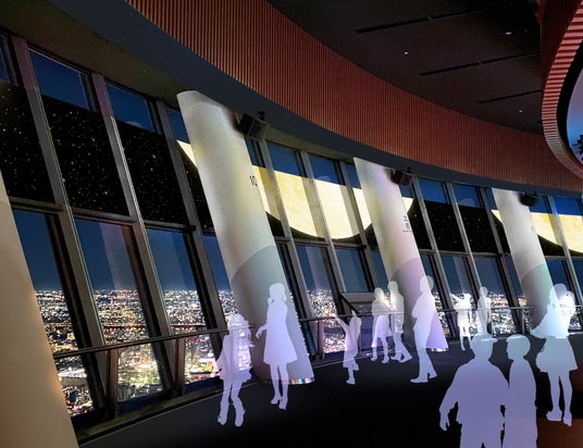 天望デッキ フロア350において、窓ガラスを巨大スクリーンに仕立て、13台のスピーカーによる臨場感溢れる音響と、24台のプロジェクターで迫力のある映像を投影する夜間限定の演出空間です。