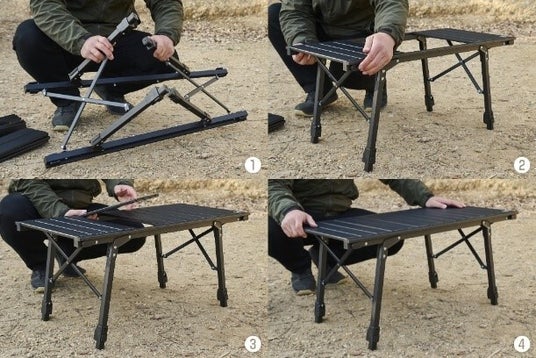 まず脚部分を開き、4枚1セットのユニットを両端に取り付けてロックをかけたら、2枚1セットのユニットをセンター部分に置いていくだけで完成。