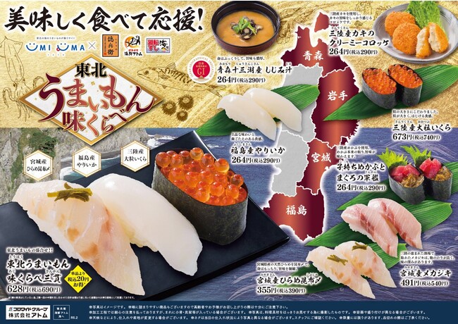 コロワイドグループの株式会社アトム(本社:神奈川県横浜市、代表取締役社長:山角豪)は、「にぎりの徳兵衛」「海鮮アトム」「海へ」の各店で、2023年2月28日(火)~3月27日(月) 東日本大震災被災地域における水産加工業等の復興を支援する復興水産加工業販路回復促進センターの運営する「東北の海のうまいものが集うサイト『UMIUMA』(https://umiuma.jp/)」とコラボレーションし、「東北うまいもん味くらべ」フェアを開催いたします。