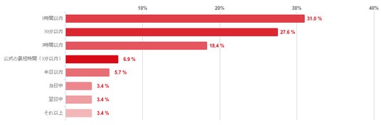 プロミスの審査結果が通知されるまでの時間は、「1時間以内」が最も多く31.0%、続いて「30分以内」が27.6%、「3時間以内」が18.4%となった。