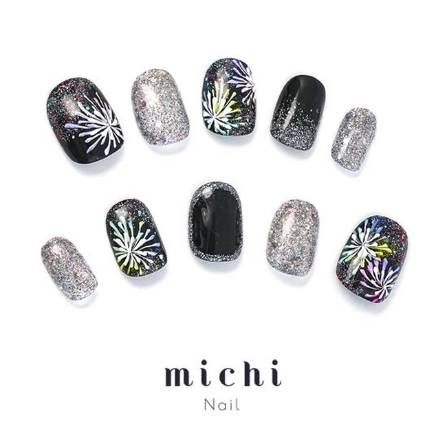 夏の夜空に打ち上げられた花火のようなネイル。フラッシュネイルという、カメラなどのフラッシュによって反射し強く光る特殊なグリッターを使用しています。夏ならではのデザインと派手すぎないダークカラーが魅力のネイルチップです。
